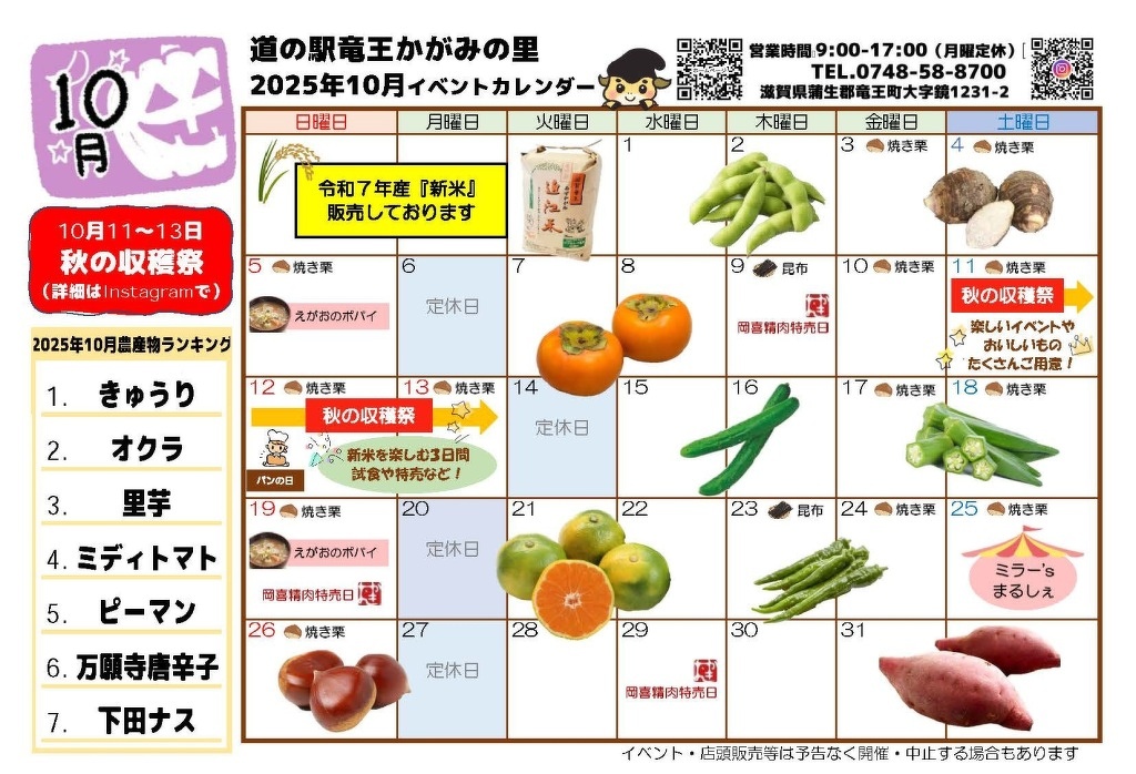 24 (日) | 道の駅竜王かがみの里21周年感謝フェア 柿直売会 焼き栗 エイト(海産物加工品)ドライフルーツ |